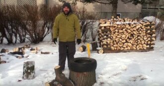 Placez un pneu sur le billot pour maintenir les bûches ensemble lorsque vous les fendez. Cela évite d’avoir à ramasser à chaque fois les bûches fendues étalées au sol.